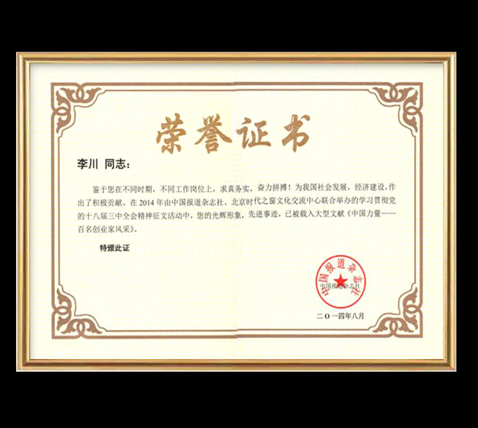 董事長(zhǎng)李川事跡載入《中國(guó)力量——百名創(chuàng)業(yè)家風(fēng)采》榮譽(yù)證書