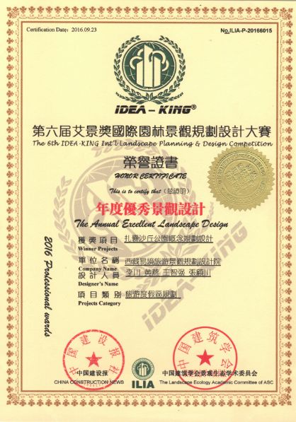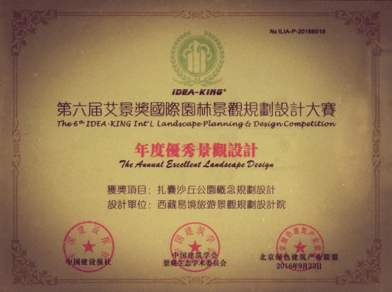 2016年11月20日,在第六屆艾景獎(jiǎng)(由中國建筑學(xué)會(huì)景觀生態(tài)學(xué)術(shù)委員會(huì)和北京綠色建筑產(chǎn)業(yè)聯(lián)盟主辦)評選中,西藏易境旅游景觀規(guī)劃設(shè)計(jì)院憑借《西藏山南市扎囊沙丘公園概念規(guī)劃設(shè)計(jì)》項(xiàng)目脫穎而出,榮獲旅游度假區(qū)規(guī)劃類別下「年度優(yōu)秀景觀設(shè)計(jì)獎(jiǎng)」這一殊榮,藏源文化沙丘公園集“休閑度假、運(yùn)動(dòng)娛樂、文化體驗(yàn)于一體”的樂活設(shè)計(jì)理念得到行業(yè)同仁的廣泛認(rèn)可。