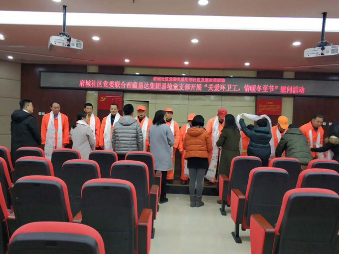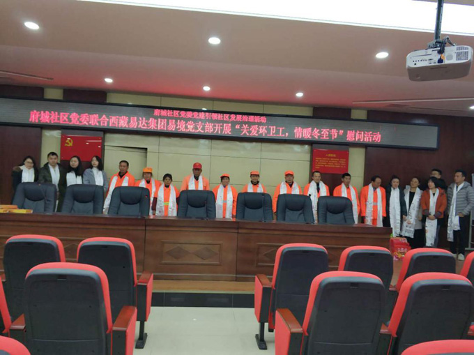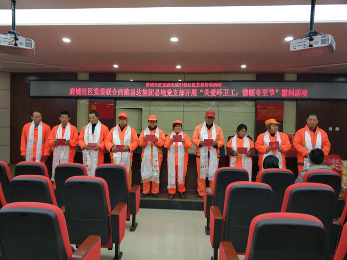 隨著漸入冬季,氣溫和天氣越發(fā)的寒冷和嚴(yán)酷,也加劇了環(huán)衛(wèi)工人清潔工作的難度,為踐行“將公益融入企業(yè)血液”的企業(yè)理念,感恩環(huán)衛(wèi)工人對城市建設(shè)的辛勤付出,為環(huán)衛(wèi)工人帶去溫暖的關(guān)懷和問候,2018年12月21日,西藏易達(dá)集團(tuán)易境黨支部聯(lián)合府城社區(qū)黨委開展了“關(guān)愛環(huán)衛(wèi)工,情暖冬至節(jié)”為主題的愛心慰問活動,黨支部數(shù)名黨員同志、府城社區(qū)黨委副書記蔣劍英、平安環(huán)衛(wèi)公司相關(guān)負(fù)責(zé)人出席了此次活動。