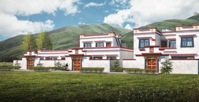 在立面整體設(shè)計(jì)上,采用現(xiàn)代藏式風(fēng)格,各個(gè)建筑單元機(jī)理均勻、有序、連續(xù)、勻稱,韻律,漸變效果很明顯。有整體感,虛實(shí)結(jié)合,飽滿而豐富,延續(xù)了村莊的建筑機(jī)理和界面,結(jié)合原有建筑成為新的視點(diǎn)。