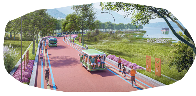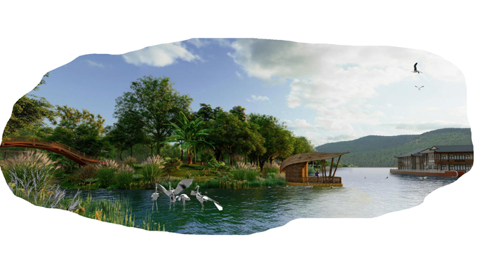 方案以“ 湖、濕地、庫(kù)岸帶、灘涂地、村落交織相融;人、鳥(niǎo)、樹(shù)和諧共生;鷺鳴綠洲,生態(tài)共享之地”為設(shè)計(jì)概念;依托基地獨(dú)有的生態(tài)景觀資源進(jìn)行生態(tài)旅游精品打造。尋找城市、自然整體發(fā)展的新模式。堅(jiān)持最小干預(yù)原則,保護(hù)地形和山水格局的整體性,建立人與環(huán)境的和諧關(guān)系。